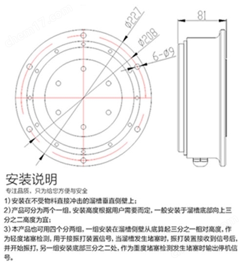 2、本系列產(chǎn)品裝置也可用四個(gè)分兩組使用,一組安裝在溜槽側(cè)壁從底算起三分之一相對高度,作為輕度堵塞檢測。用于接振打裝置信號,當(dāng) 溜槽發(fā)生堵塞時(shí),振打裝置接收到信號后,便開始振打;另一組安裝底部三分之二處,作為重度堵塞時(shí)輸出停機(jī)信號。