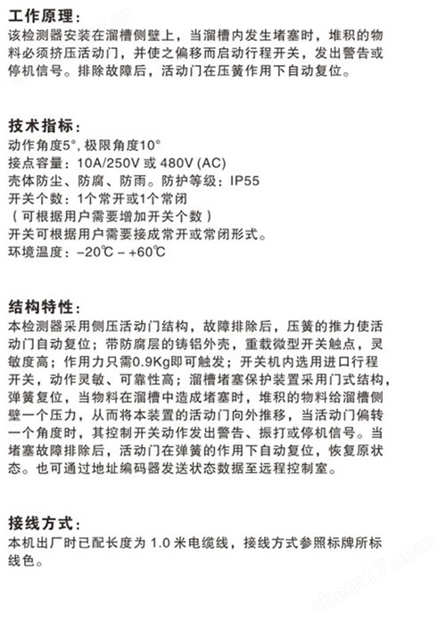 由檢測板和限位開關(guān)組成,結(jié)構(gòu)簡單,反應(yīng)迅速。當(dāng)溜槽被堵塞時(shí),檢測板受物料擠壓,向外傾斜,觸動限位開關(guān),發(fā)出停機(jī)或baojing信號 。溜槽shutong后,開關(guān)自動復(fù)位。安裝在與輸送帶平行方向的溜槽側(cè)壁。靈敏度可調(diào)整,檢測板前端的檢測力度可調(diào)范文9.8~14.7N,能檢測 小顆粒和塊狀的物料。