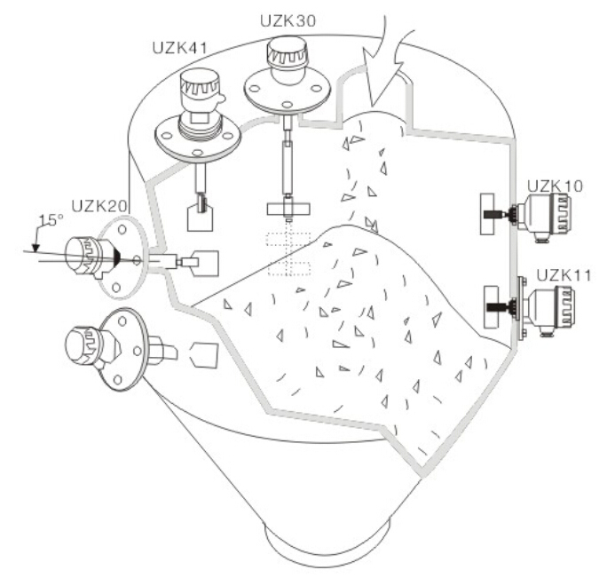 3. 測量粘度較大的粉體時,應(yīng)從容器的上部向下垂直安裝或從側(cè)壁部斜向插入安裝。